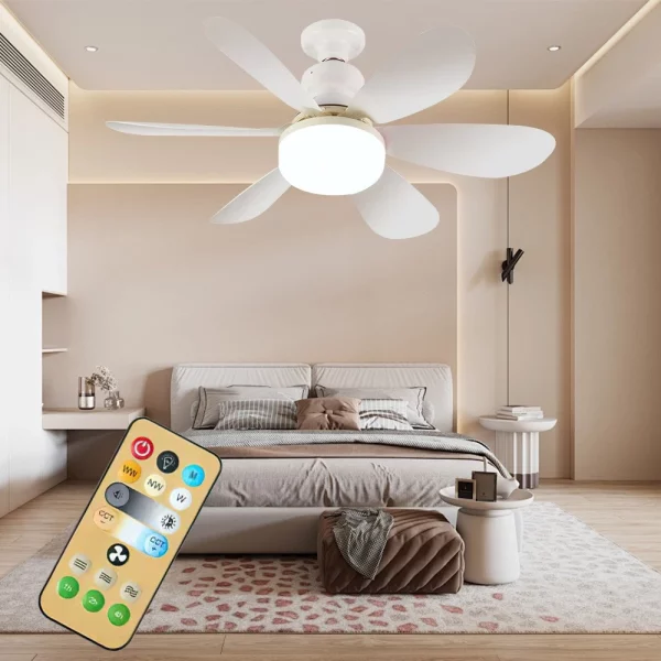 Лустерот со вентилаторот обезбедува 3 бои: ладно бело (6000K), природно бело (4500K) и топло бело (3000K) и може непречено да се прилагоди од 10% до 100, задоволувајќи ги вашите различни барања за осветлување. Создавање персонализирана и удобна атмосфера за осветлување. Поставете ја мемориската функција на светлото: исклучете го светлото и почекајте околу 15 секунди пред да го вклучите за да го поставите светлото.