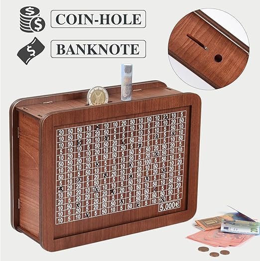 Оваа дрвена касичка е опремена со напредна технологија за броење, што овозможува прецизно следење на вашите монети и банкноти. Јасниот приказ на бројките и ознаките ви помага да го видите напредокот во реално време и да го поедноставите управувањето со вашите заштеди.