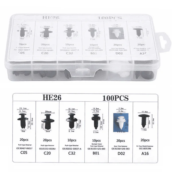 • 100 делови во комплетот, ќе ги имате сите потребни алатки и сврзувачки елементи за брзо и ефикасно решавање на разни проблеми во автомобилот, без потреба да барате дополнителни делови