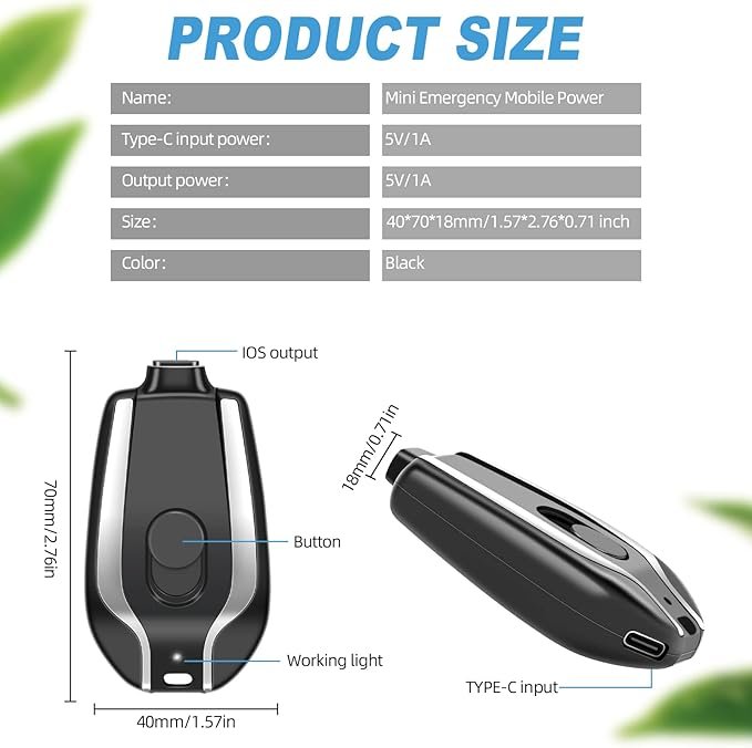 Овој привезок полнач со капацитет од 1500mAh е идеално решение за сите кои имаат проблеми со привремена недостаток на енергија на мобилни телефони, слушалки или други електронски уреди. Со својот компактен дизајн, полначот наликува на големина на клуч за автомобил и лесно се закачува на вашите клучеви како привезок, овозможувајќи ви да го носите насекаде без да изгледа непријатно или обемно.