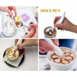 • Специјално пенкало, дизајнирано да се користи со зачини, со кое можете да бидете креативни со вашето омилено кафе или да внесете уметност во храната